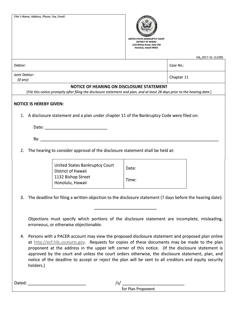 Filer s Name, Address, Phone, Fax, Email: UNITED STATES BANKRUPTCY COURT DISTRICT OF HAWAII 1132 Bishop Street, Suite 250 Honolulu, Hawaii 96813 his 3017-1b (12/09) Debtor: Case No.: Joint Debtor: