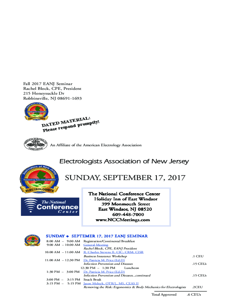Fall 2017 EANJ Seminar Rachel Block, CPE, President 215 Honeysuckle Dr Robbinsville, NJ 086911693IAL: R E T ptly! D MA m E o T r p A D espond r e s a e Pl An Affiliate of the American Electrology