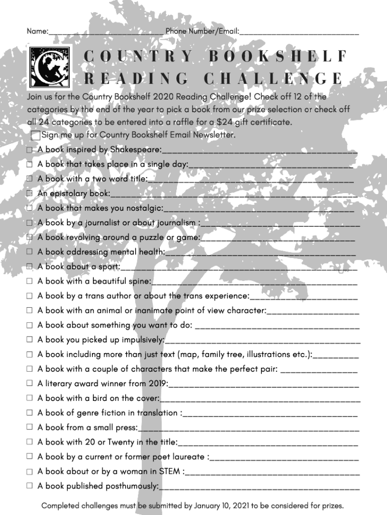 Name:___ Phone Number/Email:___COUNTRY BOOKSHELF READING CHALLENGE Join us for the Country Bookshelf 2020 Reading Challenge! Check off 12 of the categories by the end of the year to pick a book from