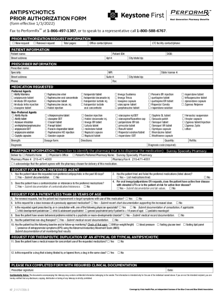 ANTIPSYCHOTICS PRIOR AUTHORIZATION FORM (form effective 1/3/2022)Fax to PerformRx at 18664971387, or to speak to a representative call 18005886767. SMPRIOR AUTHORIZATION REQUEST INFORMATION New request