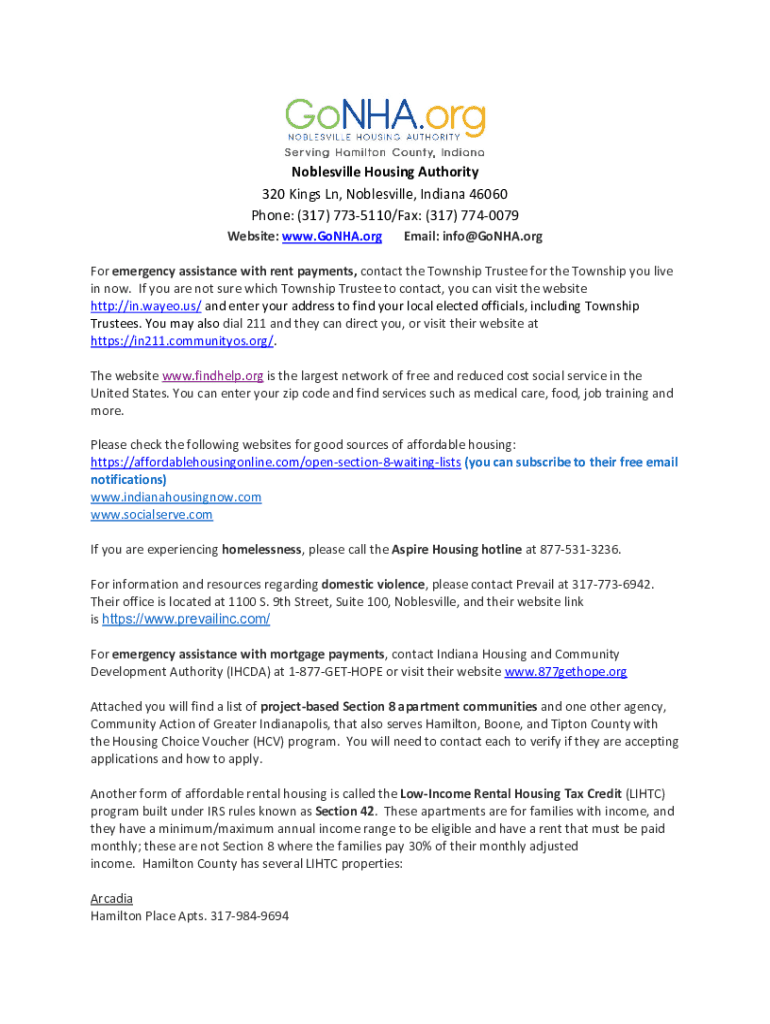 Noblesville Housing Authority 320 Kings Ln, Noblesville, Indiana 46060 Phone: (317) 7735110/Fax: (317) 7740079 Website: www.GoNHA.orgEmail: info@GoNHA.orgFor emergency assistance with rent payments,