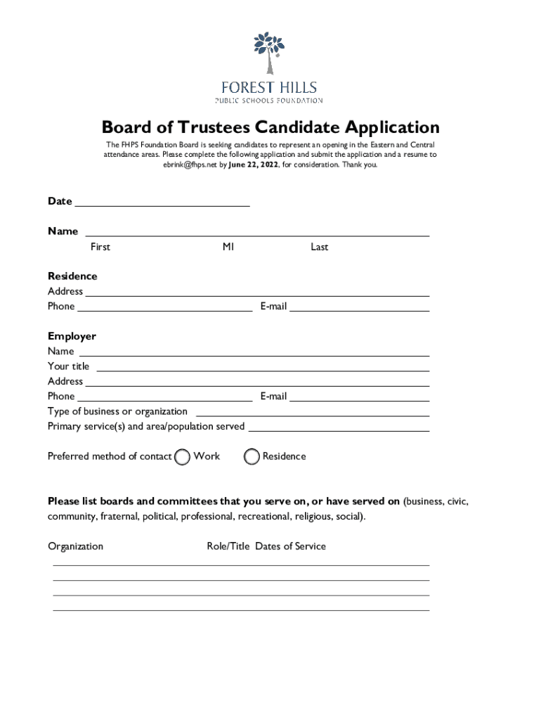 Board of Trustees Candidate Application The FHPS Foundation Board is seeking candidates to represent an opening in the Eastern and Central attendance areas. Please complete the following application
