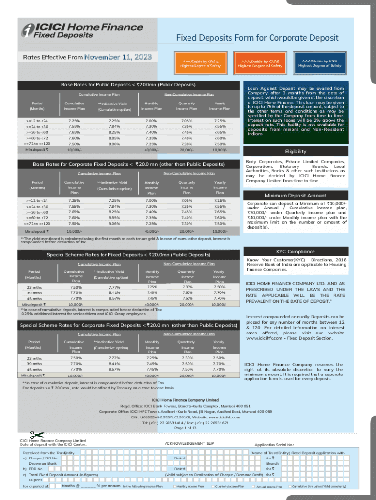 Fixed Deposits Form for Corporate Deposit Rates Effective From November 11, 2023AAA/Stable by CRISIL Highest Degree of SafetyBase Rates for Public Deposits R20.0mn (Public Deposits) NonCumulative