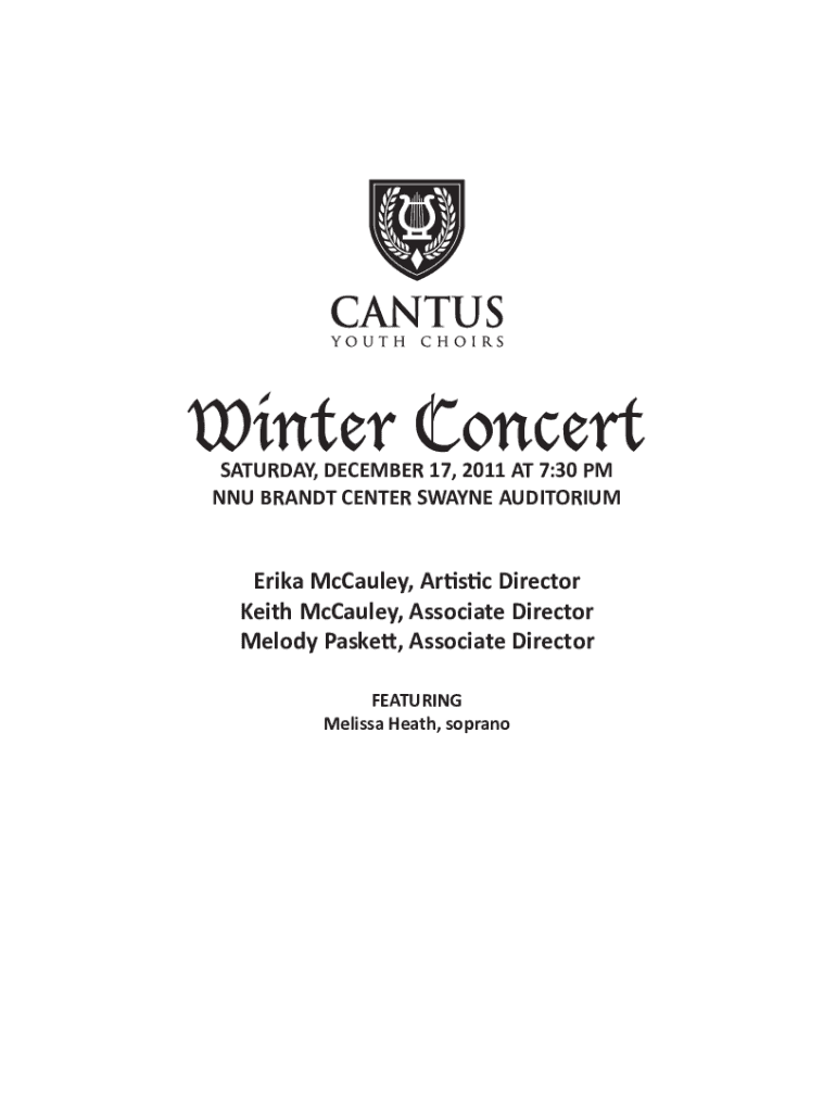 Winter Concert SATURDAY, DECEMBER 17, 2011 AT 7:30 PM NNU BRANDT CENTER SWAYNE AUDITORIUMErika McCauley, Artistic Director Keith McCauley, Associate Director Melody Paskett, Associate Director FEATURING