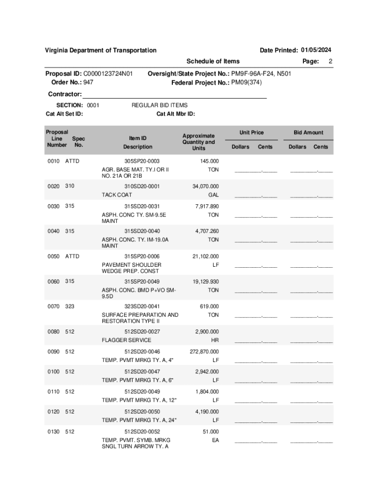 Date Printed: 01/05/2024Virginia Department of Transportation Schedule of Items Proposal ID: C0000123724N01 Order No.: 947Page:2Oversight/State Project No.: PM9F96AF24, N501 Federal Project No.: PM09(374)Contractor: