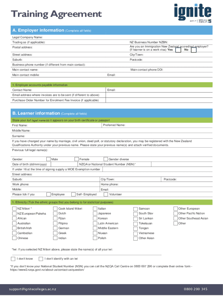 Training Agreement A. Employer information (Complete all fields) Legal Company Name:Postal address:NZ Business Number NZBN: Are you an Immigration New Zealand accredited employer? (If learner is on