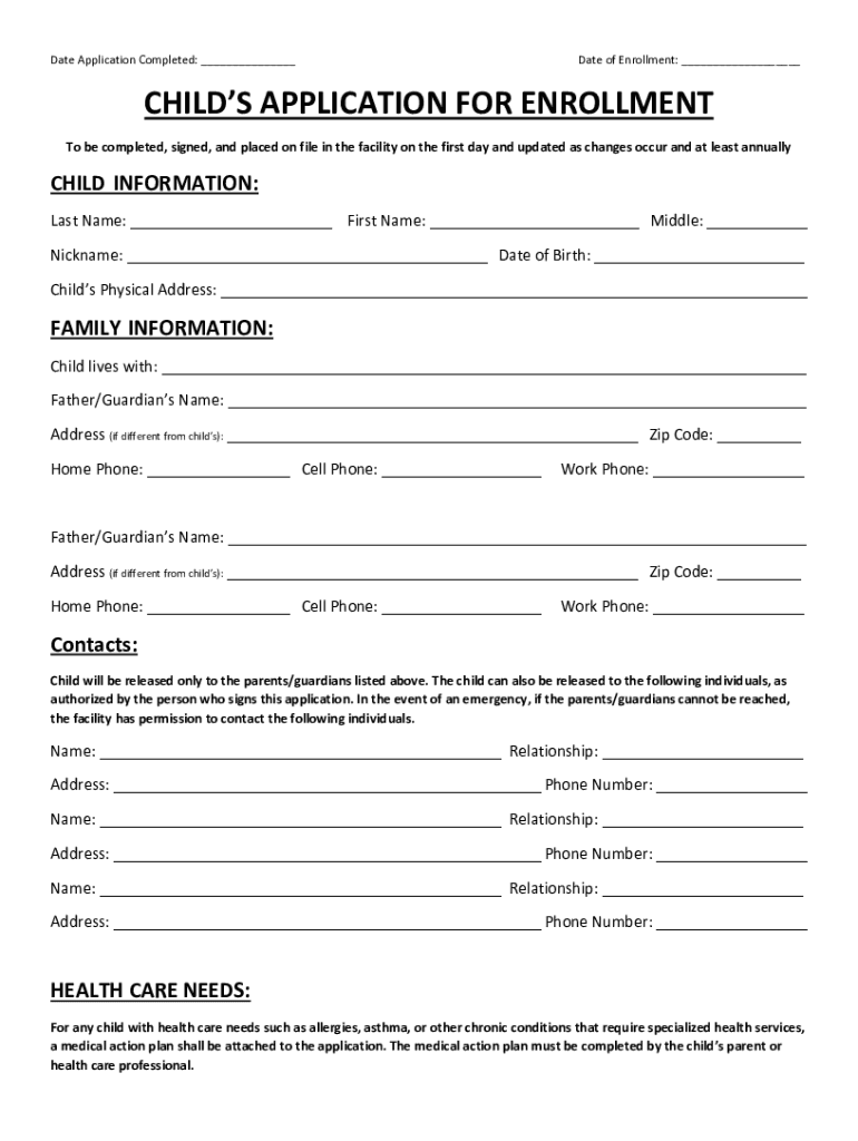 Date Application Completed: ___Date of Enrollment: ___CHILDS APPLICATION FOR ENROLLMENT To be completed, signed, and placed on file in the facility on the first day and updated as changes occur and