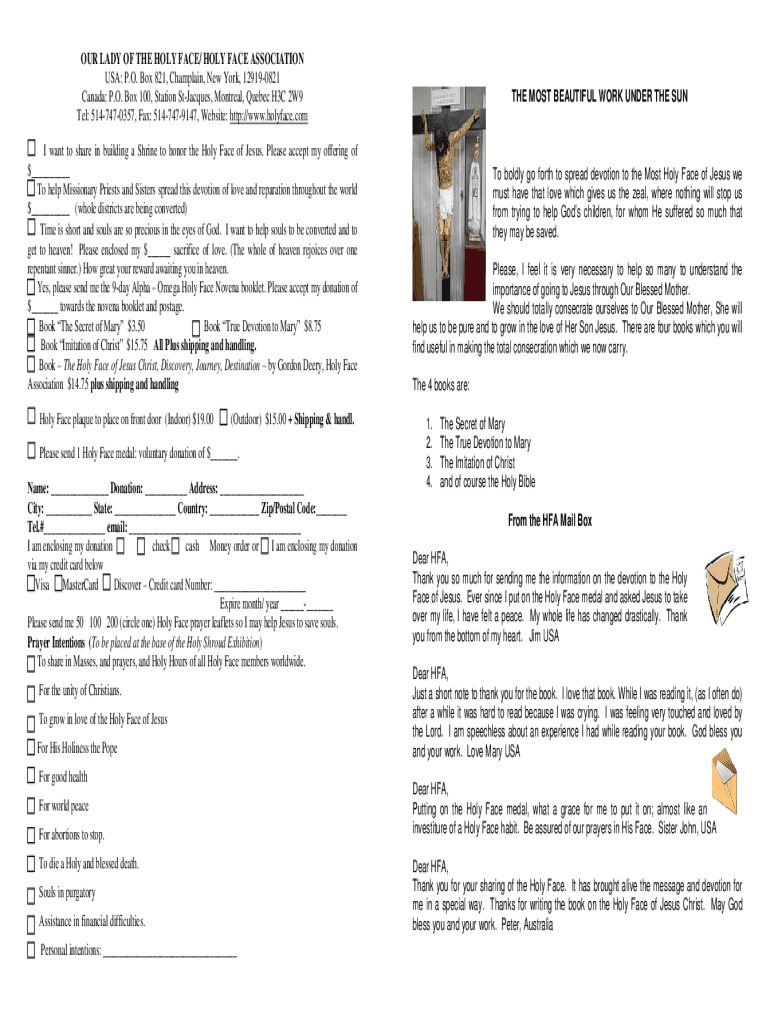 OUR LADY OF THE HOLY FACE/ HOLY FACE ASSOCIATION USA: P.O. Box 821, Champlain, New York, 129190821 Canada: P.O. Box 100, Station StJacques, Montreal, Quebec H3C 2W9 Tel: 5147470357, Fax: 5147479147,