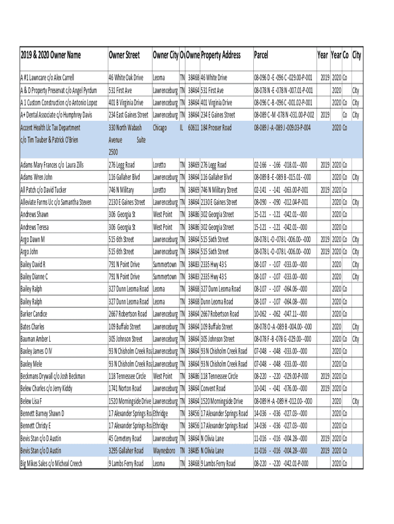 Get the free 2019 & 2020 Owner Name Owner Street Owner City Owner State ...