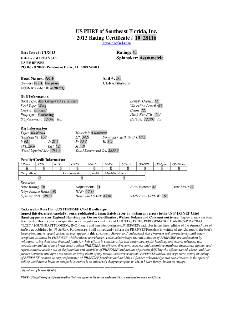 Get the free US PHRF of Southeast Florida, Inc. 2013 Rating Certificate ...