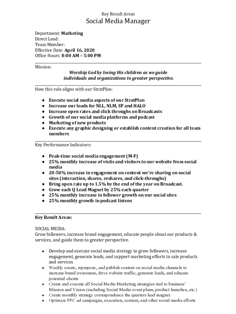 Key Result AreasSocial Media ManagerDepartment: MarketingDirect Lead:Team Member:Effective Date: April 16, 2020Office Hours: 8:00 AM 5:00 PM___Mission:Worship God by loving His children as we guideindividuals