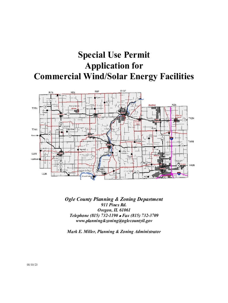 Special Use Permit Application for Commercial Wind/Solar Energy FacilitiesOgle County Planning & Zoning Department 911 Pines Rd. Oregon, IL 61061 Telephone (815) 7321190 Fax (815) 7323709 www.planning&zoning@oglecountyil.gov