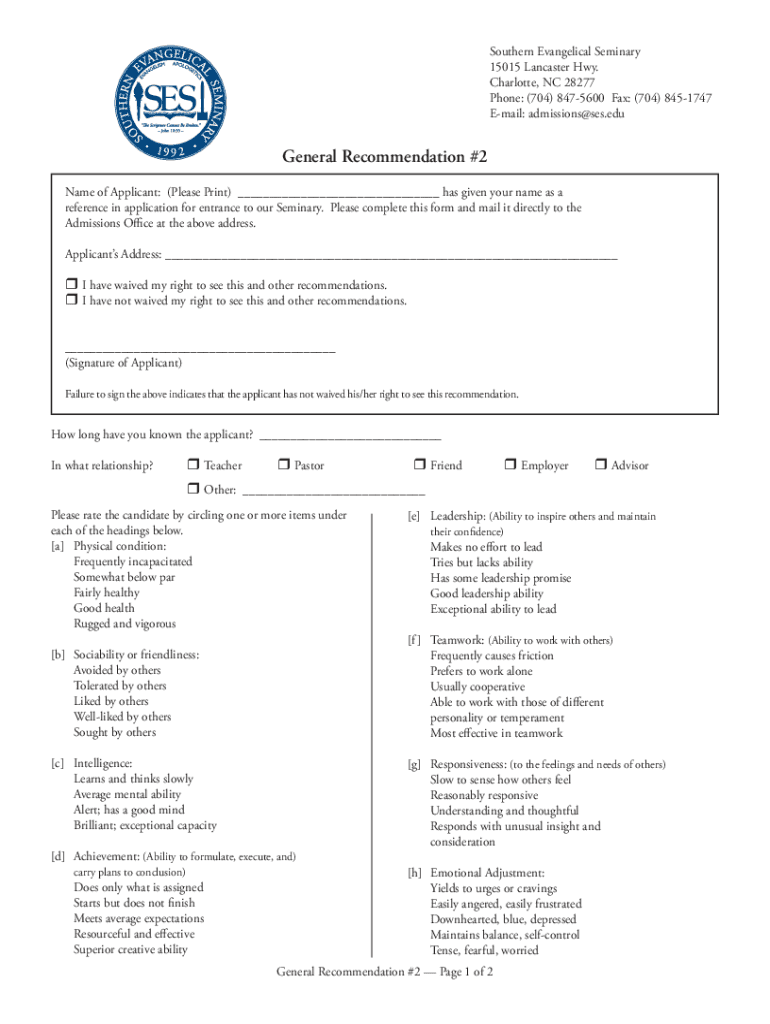 Southern Evangelical Seminary 15015 Lancaster Hwy. Charlotte, NC 28277 Phone: (704) 8475600 Fax: (704) 8451747 Email: admissions@ses.eduGeneral Recommendation #2 Name of Applicant: (Please Print)