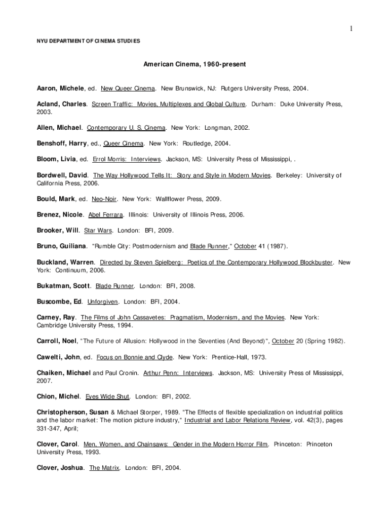 1 NYU DEPARTMENT OF CINEMA STUDIESAmerican Cinema, 1960present Aaron, Michele, ed. New Queer Cinema. New Brunswick, NJ: Rutgers University Press, 2004. Acland, Charles. Screen Traffic: Movies, Multiplexes