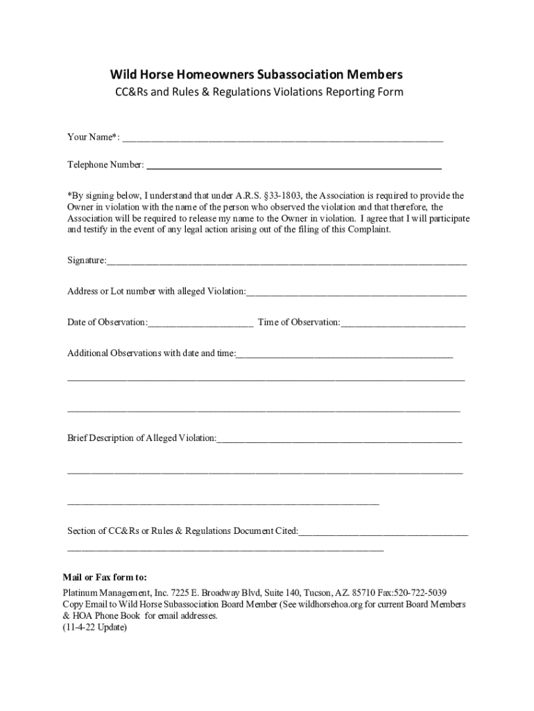 Wild Horse Homeowners Subassociation Members CC&Rs and Rules & Regulations Violations Reporting FormYour Name*: ___ Telephone Number: *By signing below, I understand that under A.R.S. 331803, the
