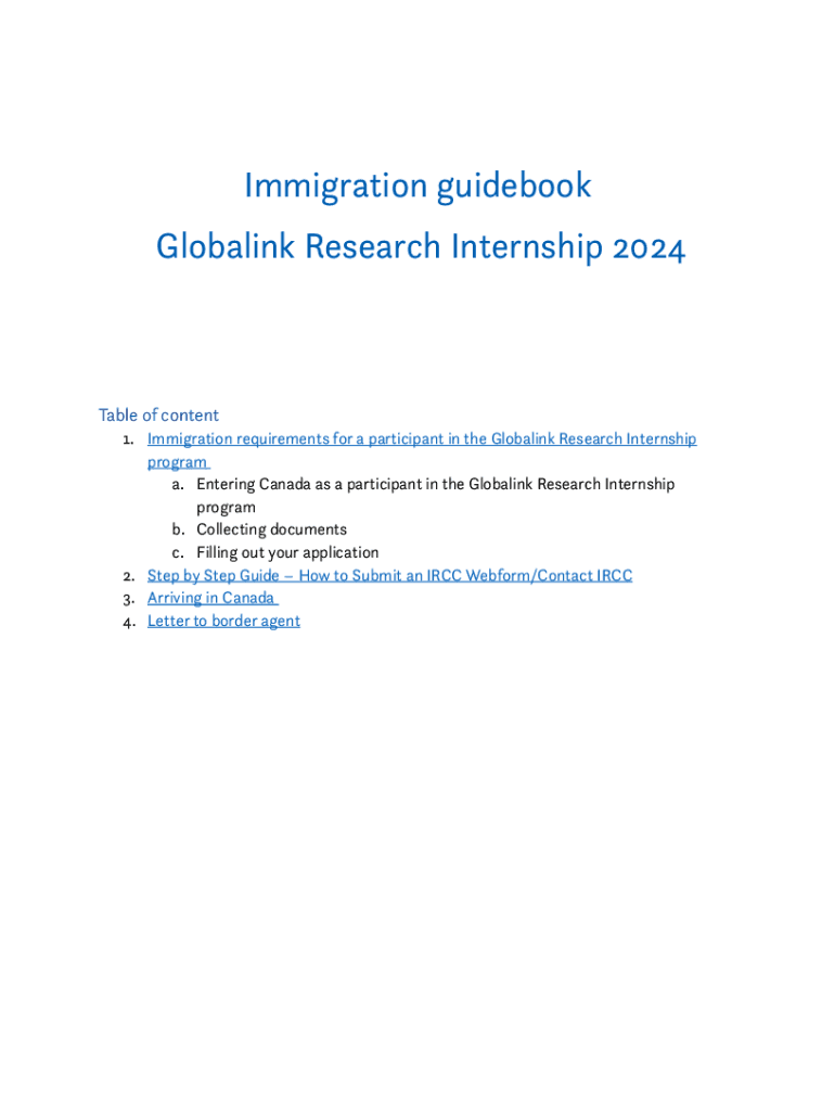 Immigration guidebook Globalink Research Internship 2024Table of content 1. Immigration requirements for a participant in the Globalink Research Internship program a. Entering Canada as a participant