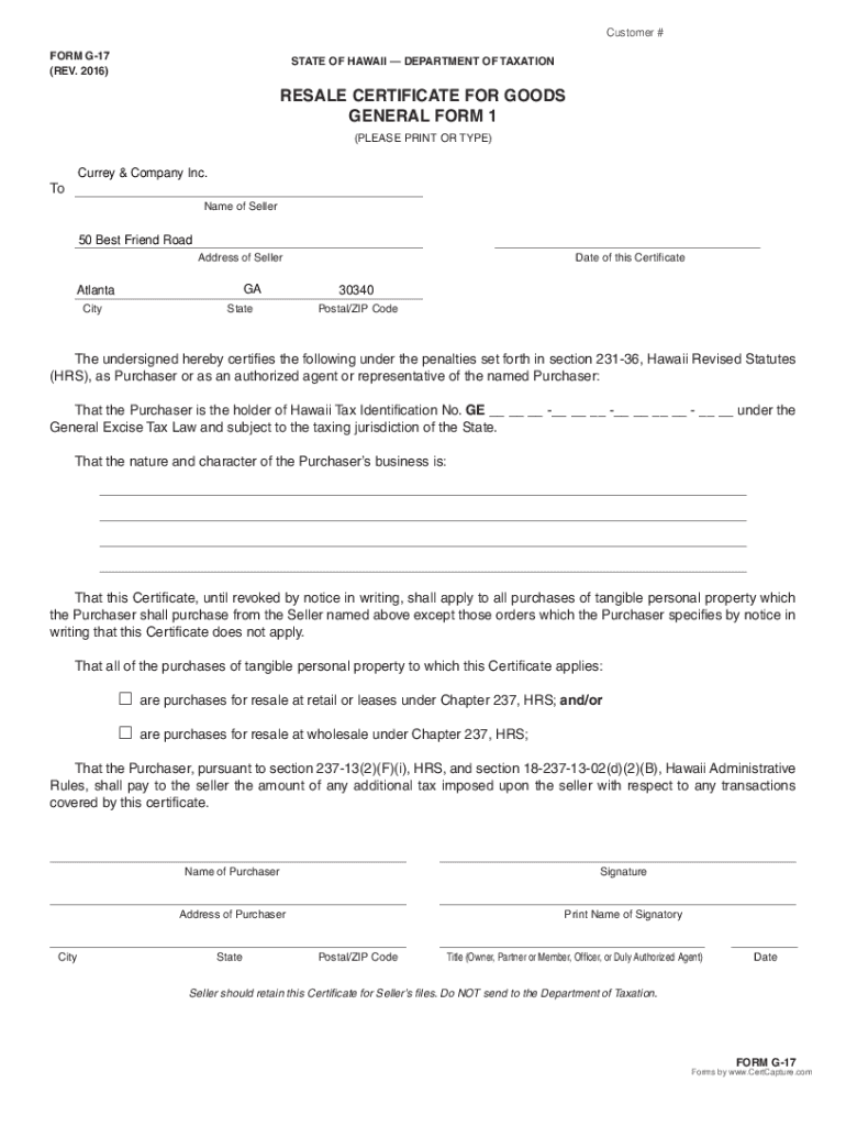 Customer #FORM G17 (REV. 2016)STATE OF HAWAII DEPARTMENT OF TAXATIONRESALE CERTIFICATE FOR GOODS GENERAL FORM 1 (PLEASE PRINT OR TYPE)Currey & Company Inc.To Name of Seller50 Best Friend Road Address