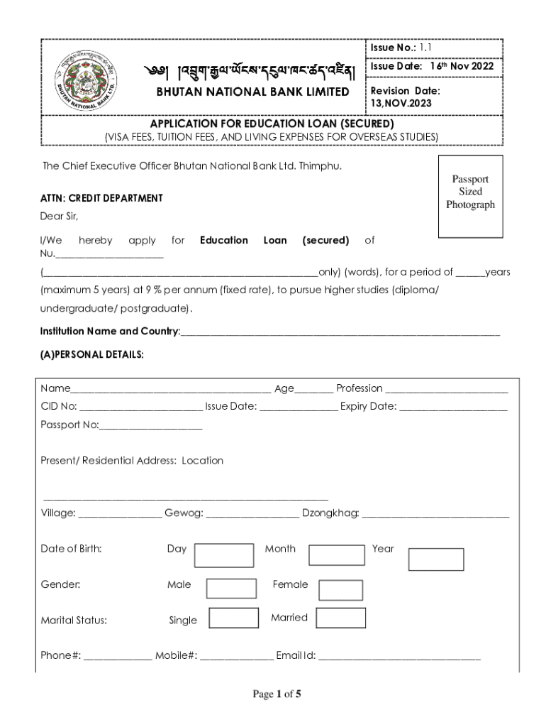 Issue No.: 1.1 Issue Date: 16th Nov 2022 Revision Date: 13,NOV.2023APPLICATION FOR EDUCATION LOAN (SECURED) (VISA FEES, TUITION FEES, AND LIVING EXPENSES FOR OVERSEAS STUDIES) The Chief Executive