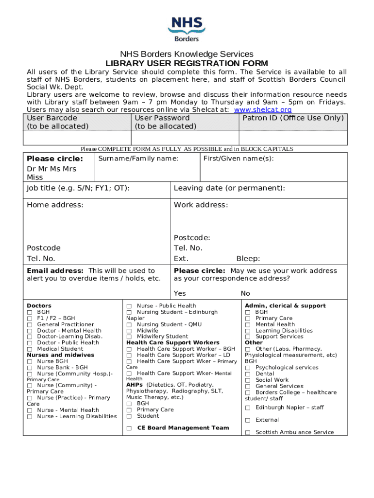 Instructions for the form NHS Borders Knowledge Services - Library User Registration