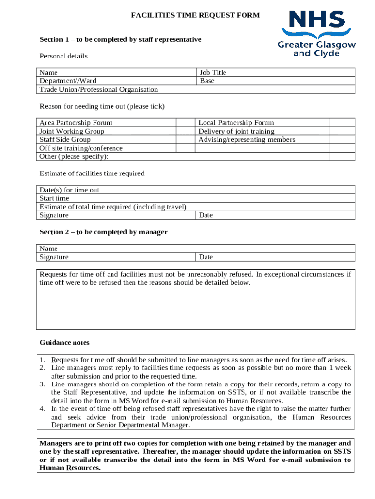 The FACILITIES TIME REQUEST is a writable document that has to be filled-out and signed for specific purpose. Then, it is furnished to the exact addressee in order to provide some details and data. The completion and signing is able manually or using a suitable tool e. g. PDFfiller. These tools help to submit any PDF or Word file without printing out. While doing that, you can edit its appearance depending on your needs and put a valid digital signature. Once finished, you send the FACILITIES TIME REQUEST to the respective recipient or several of them by email or fax. PDFfiller has a feature and options that make your Word form printable. It has different settings for printing out. No matter, how you'll send a document - in hard copy or electronically - it will always look well-designed and clear. In order not to create a new editable template from scratch all the time, turn the original file into a template. Later, you will have a rewritable sample.