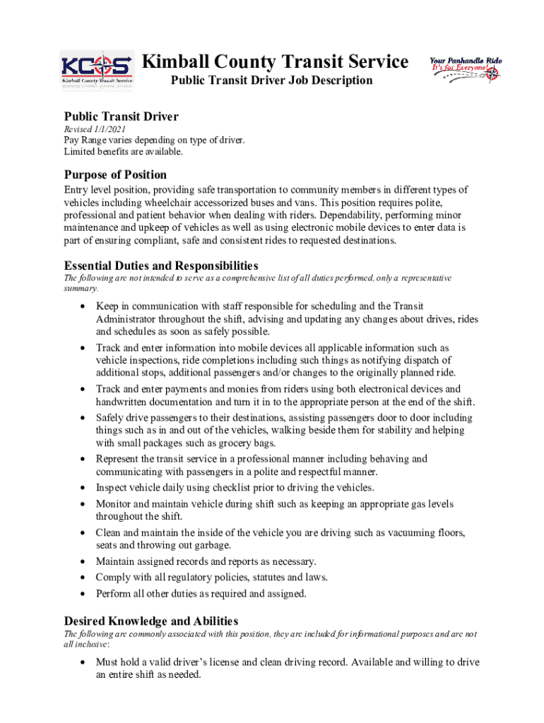Kimball County Transit Service Public Transit Driver Job DescriptionPublic Transit Driver Revised 1/1/2021Pay Range varies depending on type of driver. Limited benefits are available.Purpose of PositionEntry