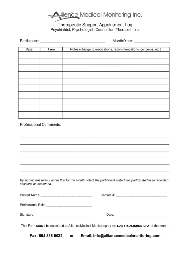 Therapeutic Support Appointment Log Psychiatrist, Psychologist, Counsellor, Therapist, etc. Participant: ___ DateTimeMonth/Year: ___Notes (change to medications, recommendations, concerns, etc.)Professional