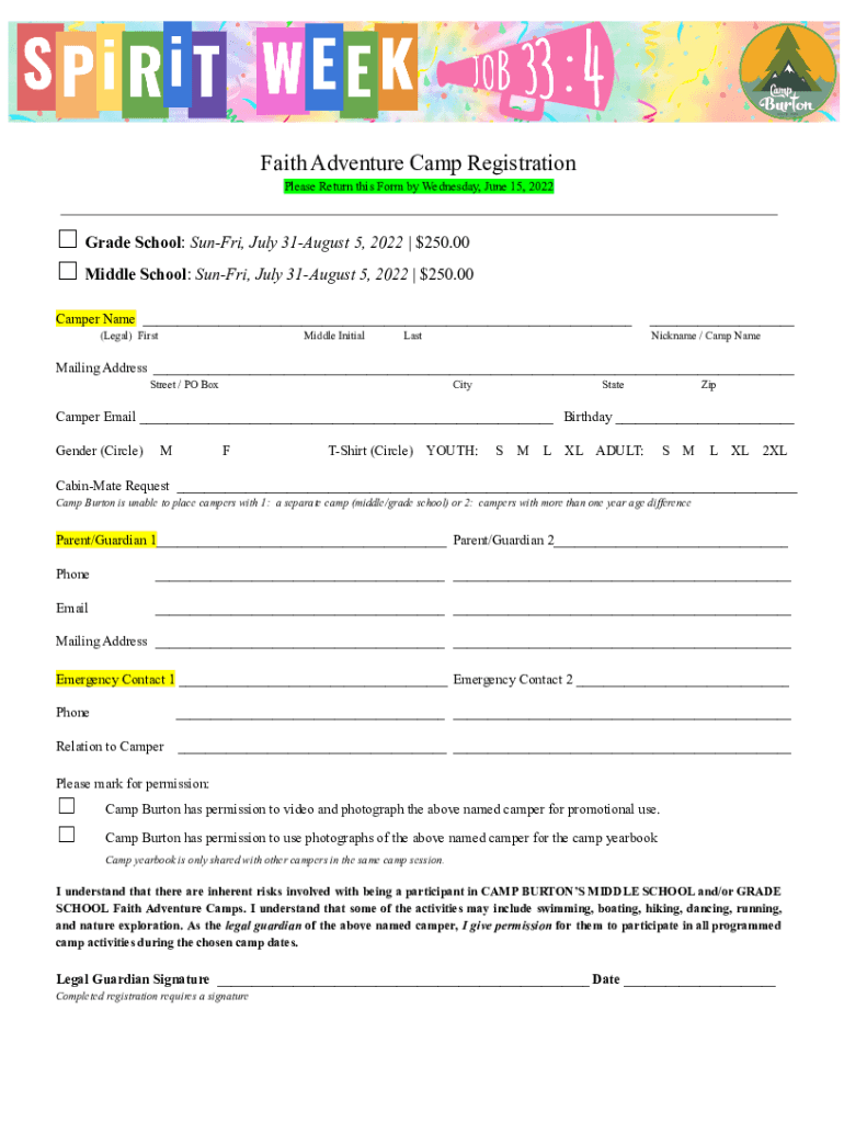 Faith Adventure Camp Registration Please Return this Form by Wednesday, June 15, 2022 Grade School: SunFri, July 31August 5, 2022 | $250.00 Middle School: SunFri, July 31August 5, 2022 | $250.00 Camper