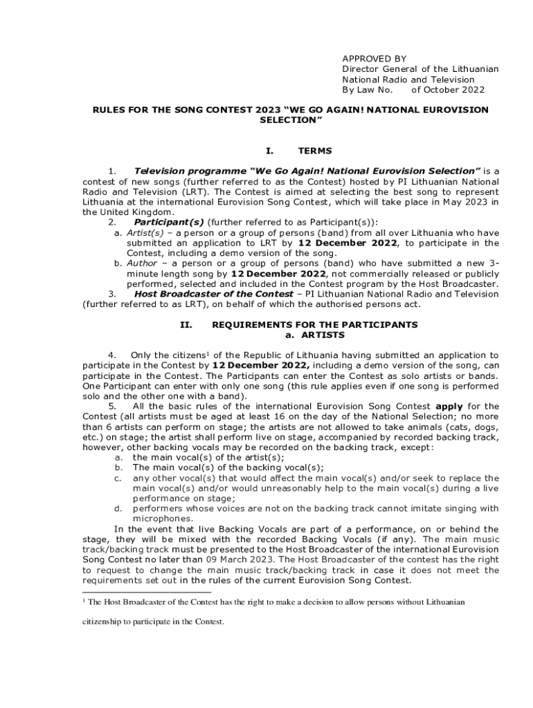APPROVED BY Director General of the Lithuanian National Radio and Television By Law No. of October 2022 RULES FOR THE SONG CONTEST 2023 WE GO AGAIN! NATIONAL EUROVISION SELECTION I.TERMS1. Television
