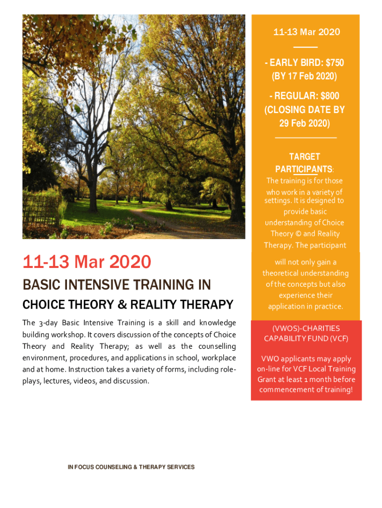1113 Mar 2020 EARLY BIRD: $750 (BY 17 Feb 2020) REGULAR: $800 (CLOSING DATE BY 29 Feb 2020) TARGET PARTICIPANTS: The training is for those who work in a variety of settings. It is designed to provide