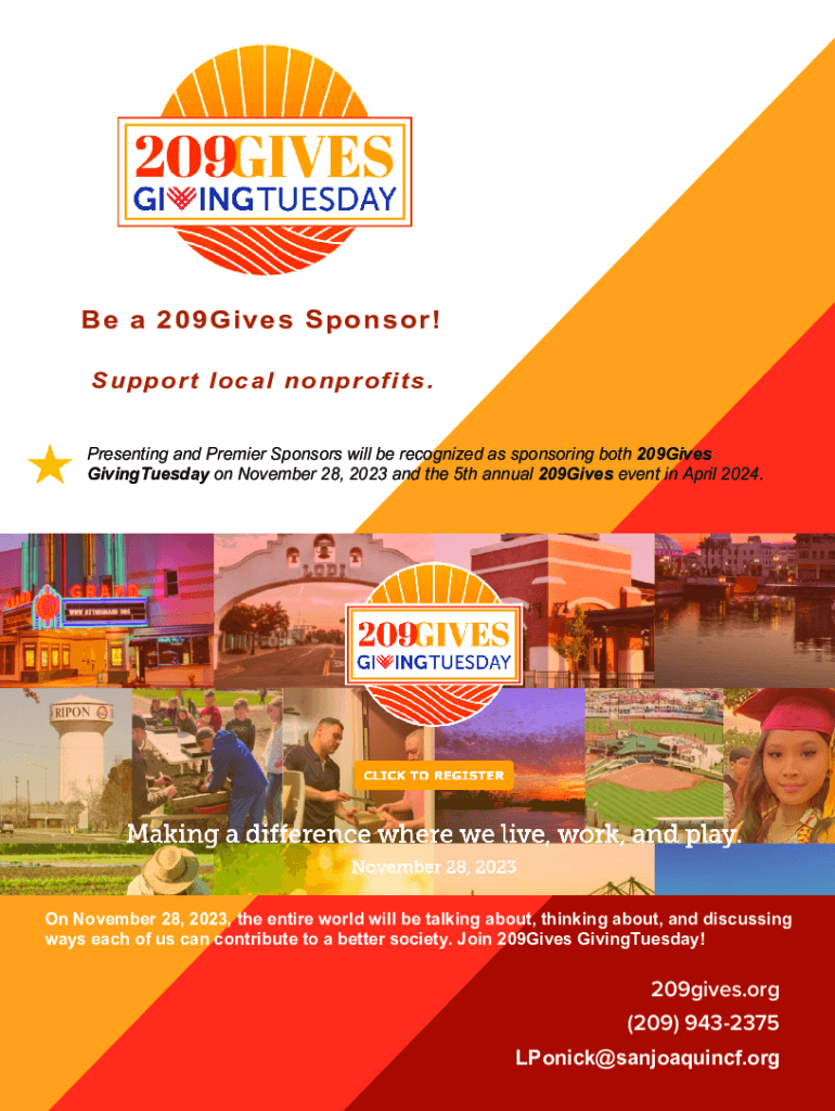 Be a 209Gives Sponsor! Support local nonprofits. Presenting and Premier Sponsors will be recognized as sponsoring both 209Gives GivingTuesday on November 28, 2023 and the 5th annual 209Gives event