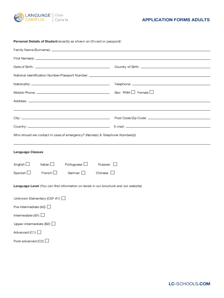APPLICATION FORMS ADULTSPersonal Details of Student (exactly as shown on ID card or passport): Family Name (Surname): First Name(s): Date of Birth:Country of Birth:National Identification Number/Passport