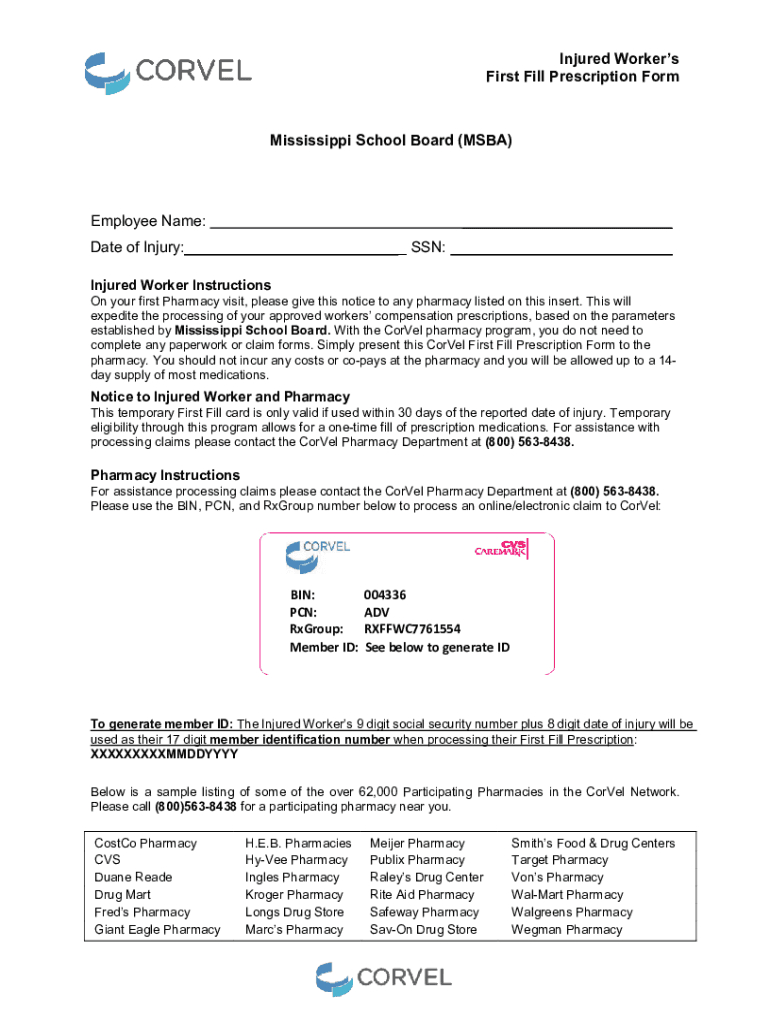 Injured Workers First Fill Prescription FormMississippi School Board (MSBA)Employee Name:___Date of Injury:_ SSN: ___Injured Worker InstructionsOn your first Pharmacy visit, please give this notice