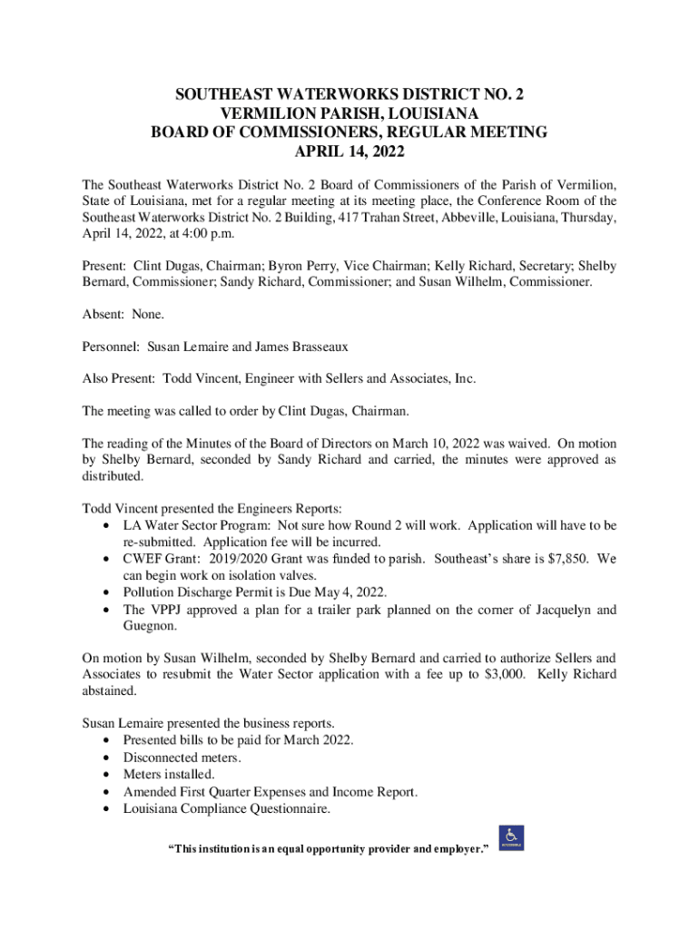 SOUTHEAST WATERWORKS DISTRICT NO. 2 VERMILION PARISH, LOUISIANA BOARD OF COMMISSIONERS, REGULAR MEETING APRIL 14, 2022, The Southeast Waterworks District No. 2 Board of Commissioners of the Parish