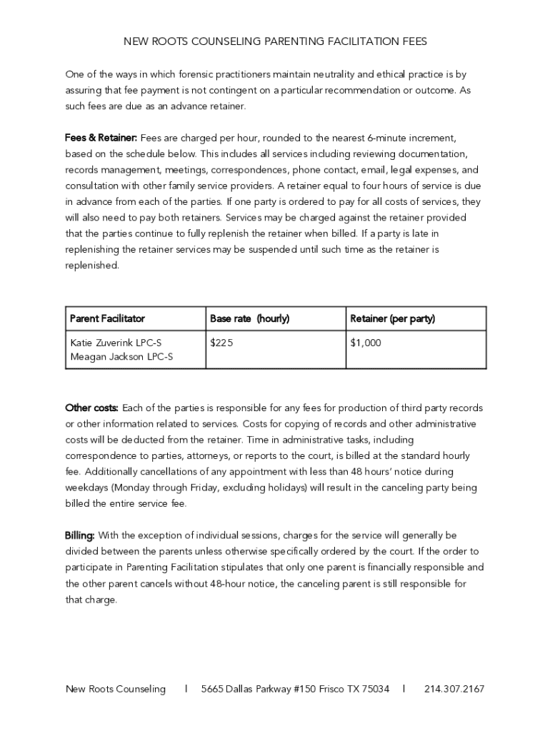 NEW ROOTS COUNSELING PARENTING FACILITATION FEES One of the ways in which forensic practitioners maintain neutrality and ethical practice is by assuring that fee payment is not contingent on a particular