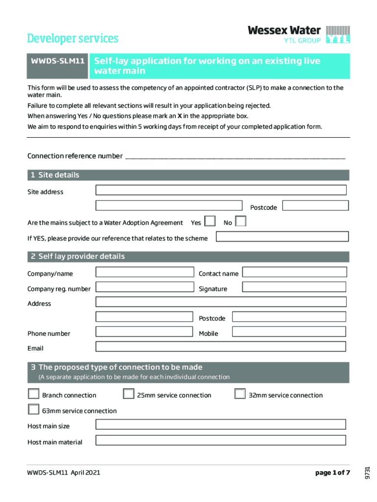 Developer services WWDSSLM11Selflay application for working on an existing live water mainThis form will be used to assess the competency of an appointed contractor (SLP) to make a connection to the