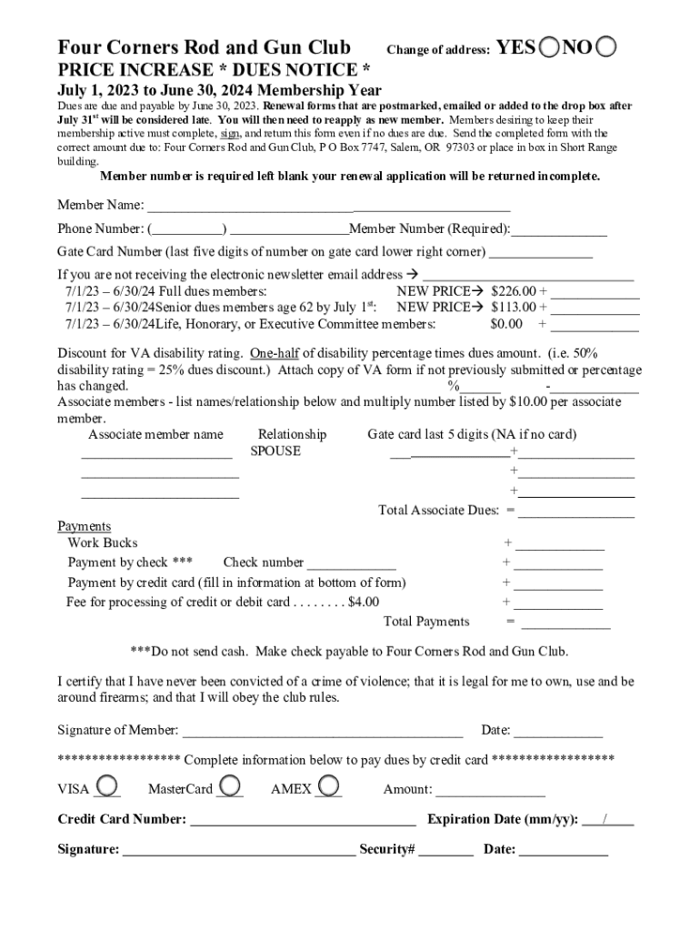 Four Corners Rod and Gun ClubPRICE INCREASE * DUES NOTICE *Change of address:YESNOJuly 1, 2023 to June 30, 2024 Membership YearDues are due and payable by June 30, 2023. Renewal forms that are postmarked,