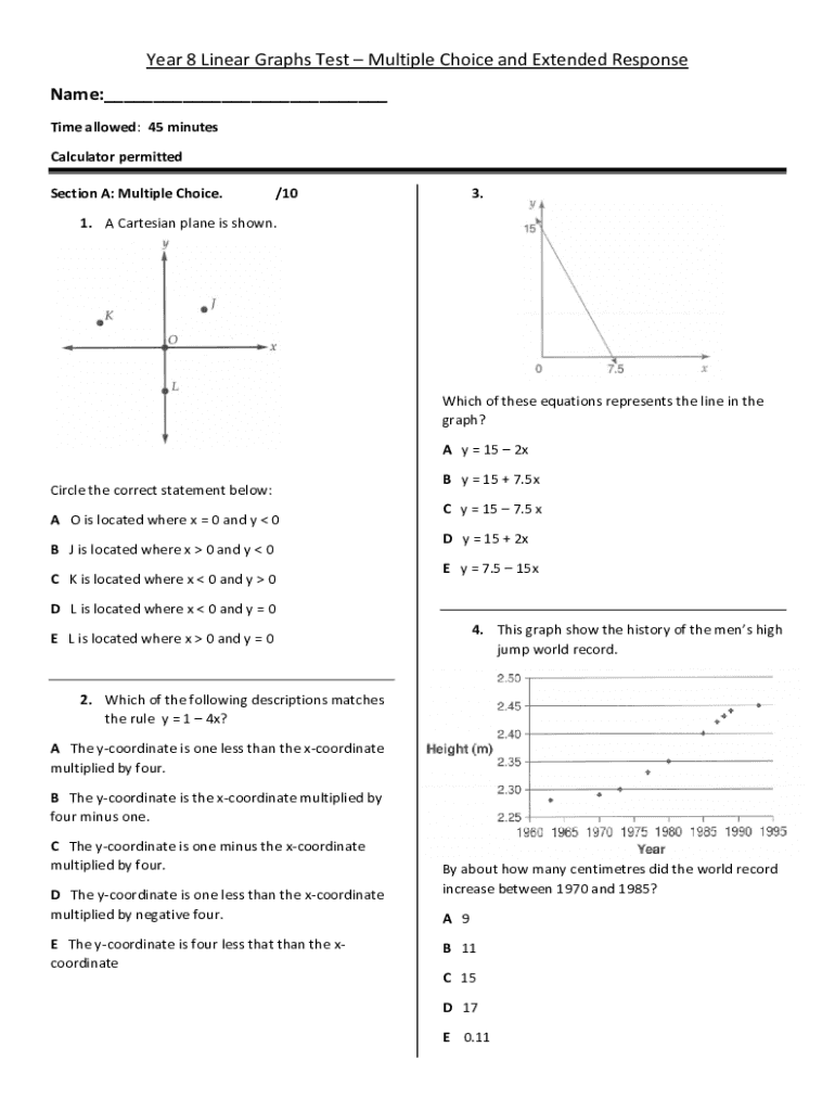 Year 8 Linear Graphs Test Multiple Choice and Extended Response Name:___ Time allowed: 45 minutes Calculator permitted Section A: Multiple Choice./103.1. A Cartesian plane is shown.Which of these