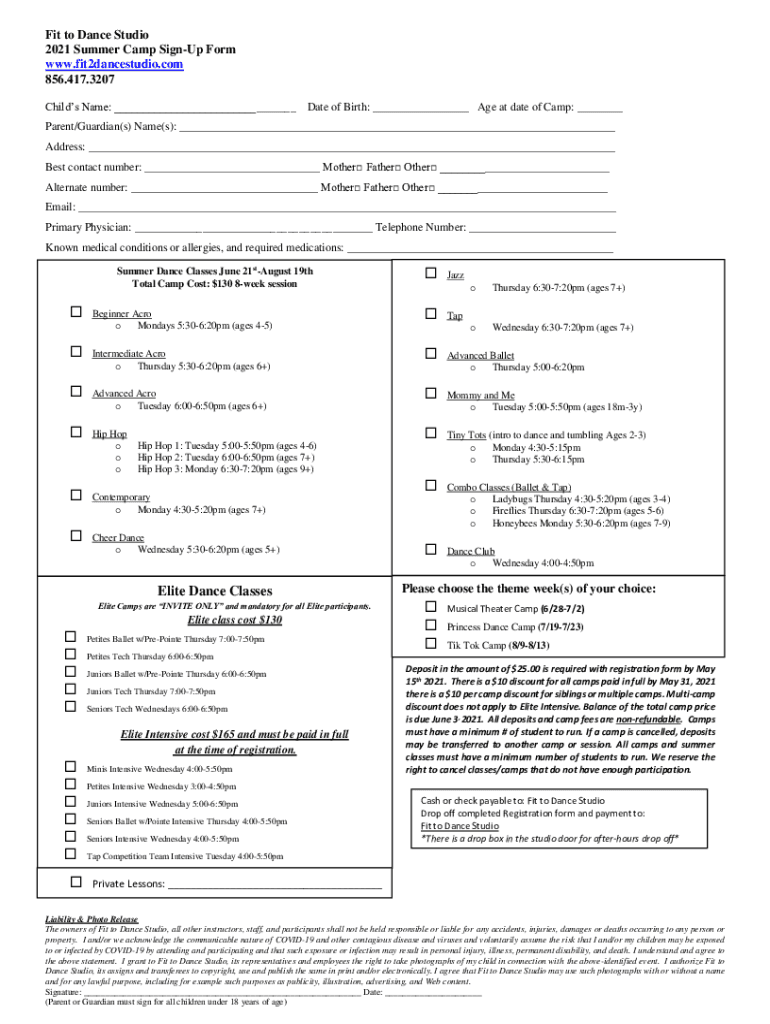 Fit to Dance Studio 2021 Summer Camp SignUp Form www.fit2dancestudio.com 856.417.3207 Childs Name: ___Date of Birth: ___ Age at date of Camp: ___Parent/Guardian(s) Name(s): ___ Address: ___ Best contact