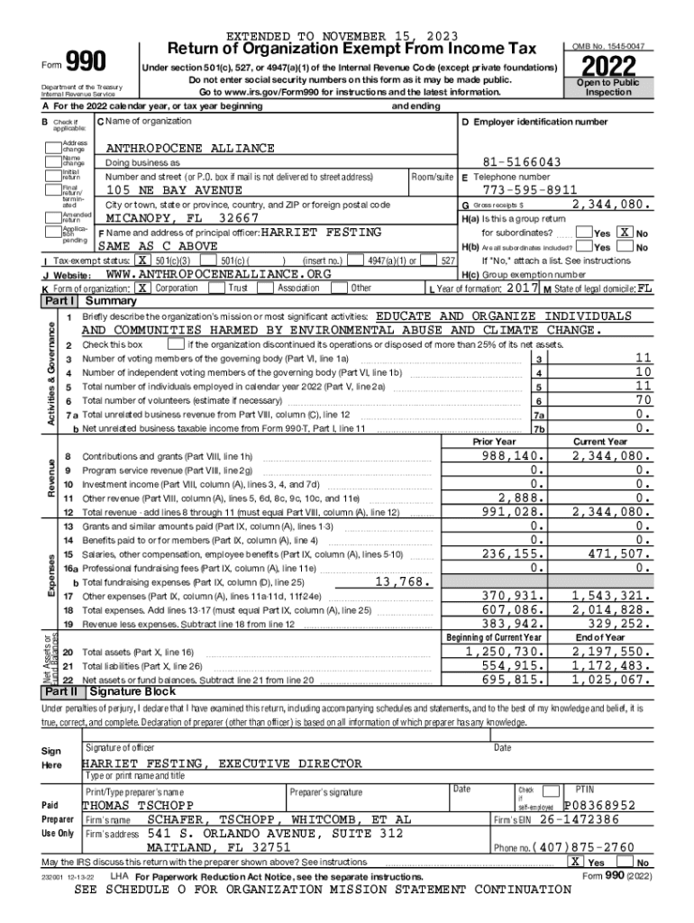 EXTENDED TO NOVEMBER 15, 2023FormReturn of Organization Exempt From Income Tax990Department of the Treasury Internal Revenue Service D Employer identification numberANTHROPOCENE ALLIANCEAddress change
