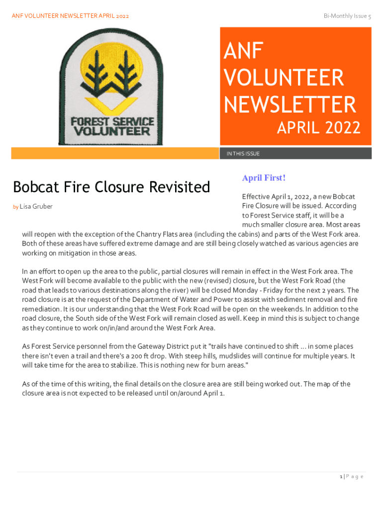 ANF VOLUNTEER NEWSLETTER APRIL 2022BiMonthly Issue 5ANF VOLUNTEER NEWSLETTERAPRIL 2022IN THIS ISSUEBobcat Fire Closure RevisitedApril First!Effective April 1, 2022, a new Bobcat Fire Closure will