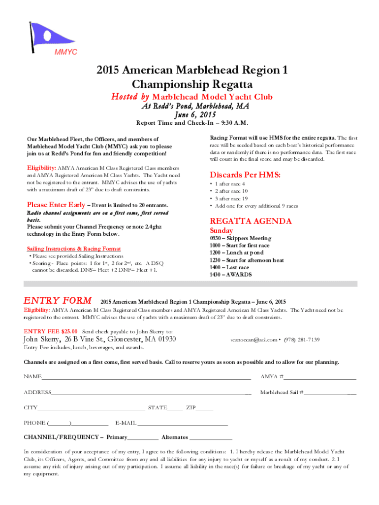 2015 American Marblehead Region 1 Championship Regatta Hosted by Marblehead Model Yacht Club At Redds Pond, Marblehead, MA June 6, 2015Report Time and CheckIn 9:30 A.M.Racing Format will use HMS for