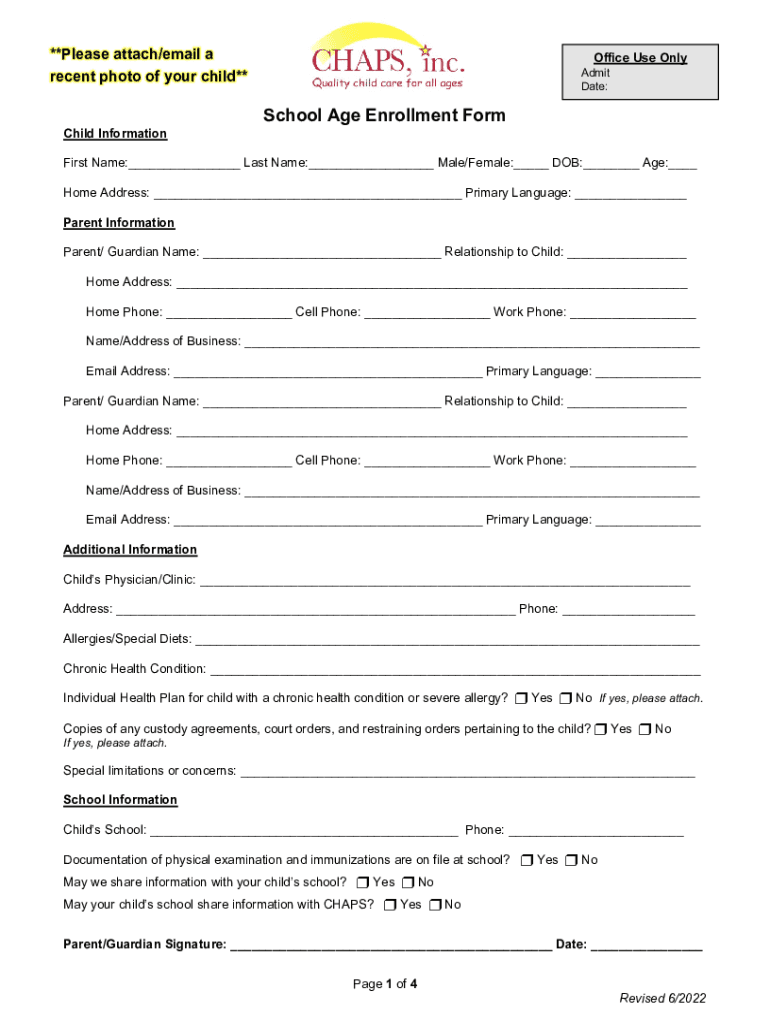 **Please attach/email a recent photo of your child** Child InformationOffice Use OnlyAdmit Date:School Age Enrollment FormFirst Name:___ Last Name:___ Male/Female:___ DOB:___ Age:___ Home Address: