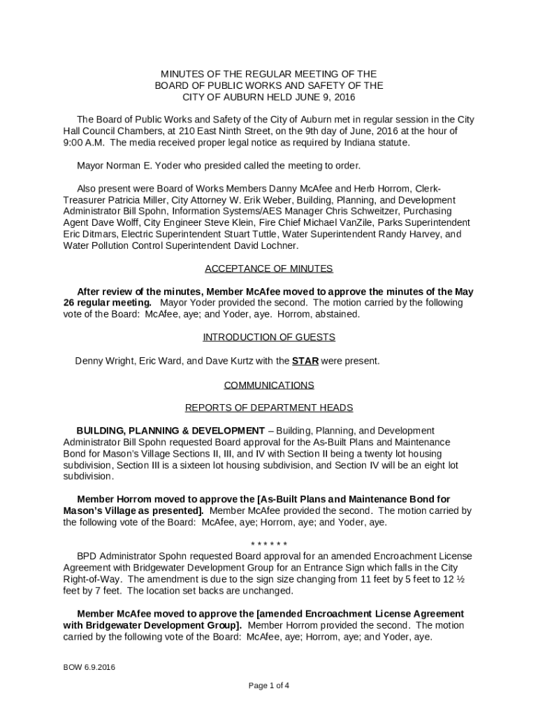 How should you fill out the The Board of Public Works and Safety of the City of Auburn met in regular session in the City Hall Council Chambers, at 210 East Ninth Street, on the 9th day of June, 2016 at the hour of 9:00 A - ftp ci auburn in template