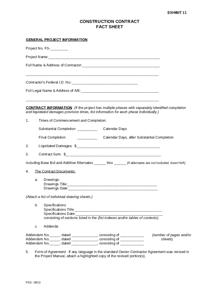 Exhibit 11, Construction Contract Fact Sheet template instructions