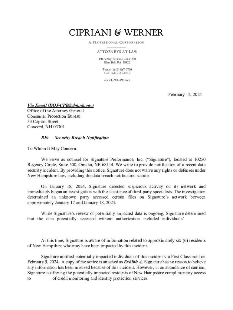A P RO F E S S I O N A L C O R P O R AT I O N ___ATTORNEYS AT LAW 450 Sentry Parkway, Suite 200 Blue Bell, PA 19422 Phone: (610) 5670700 Fax: (610) 5670712 www.CWLAW.comFebruary 12, 2024 Via Email