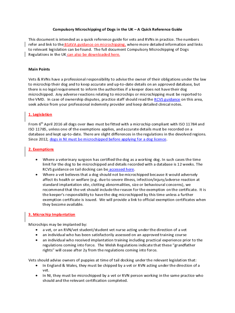 Compulsory Microchipping of Dogs in the UK A Quick Reference Guide This document is intended as a quick reference guide for vets and RVNs in practice. The numbers refer and link to the BSAVA guidance