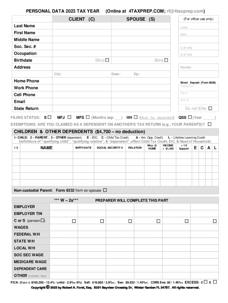 PERSONAL DATA 2023 TAX YEAR(Online at 4TAXPREP.COM; rf@4taxprep.com)CLIENT (C)SPOUSE (S)(For office use only)Last NamecodeFirst NamedateMiddle Name Soc. Sec. #C IP PINOccupationS IP PINBirthdateBlindBlindAddressCounty:City:State:Zip:Home