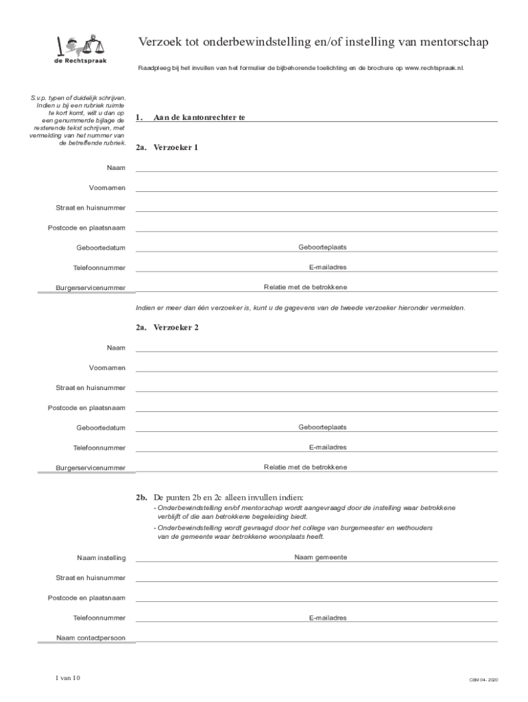 Verzoek tot onderbewindstelling en/of instelling van mentorschap Raadpleeg bij het invullen van het formulier de bijbehorende toelichting en de brochure op www.rechtspraak.nl.S.v.p. typen of duidelijk