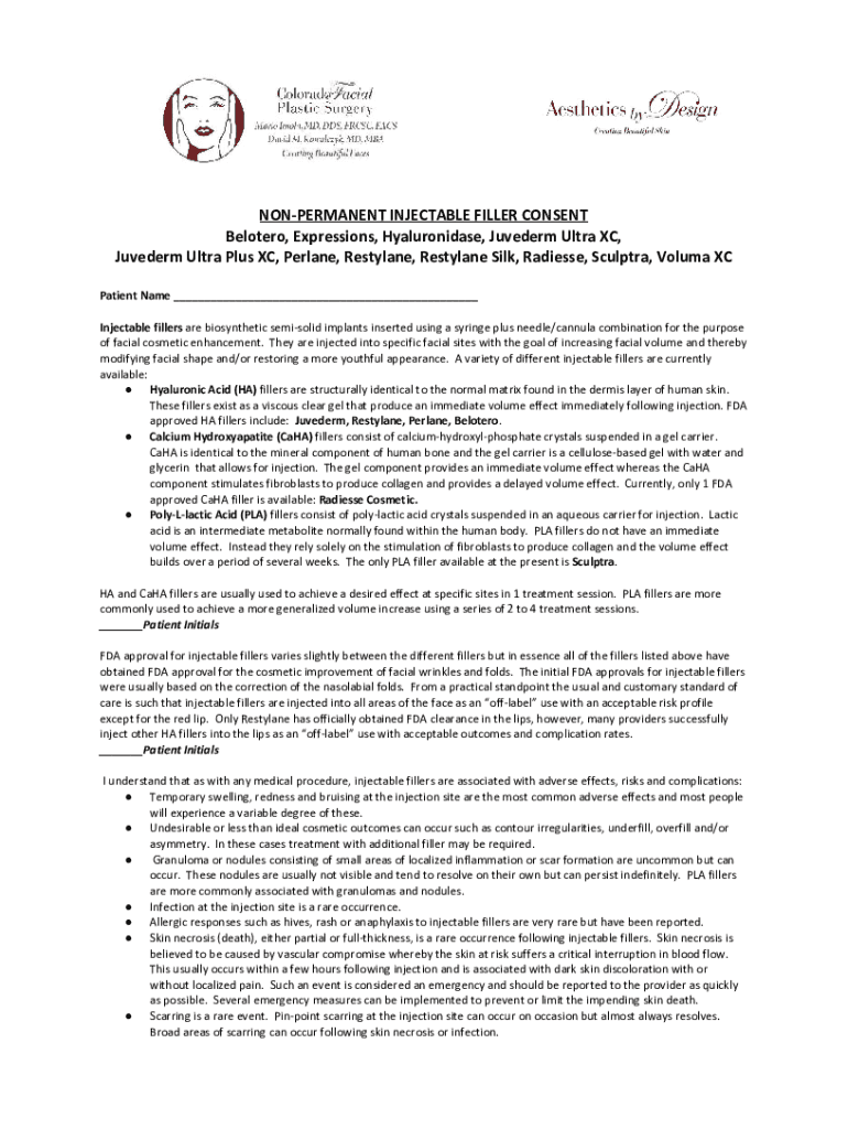 NONPERMANENT INJECTABLE FILLER CONSENT Belotero, Expressions, , Juvederm Ultra XC, Juvederm Ultra Plus XC, , , Silk, Radiesse, , Voluma XC Patient Name ___ Injectable fillers are biosynthetic semisolid