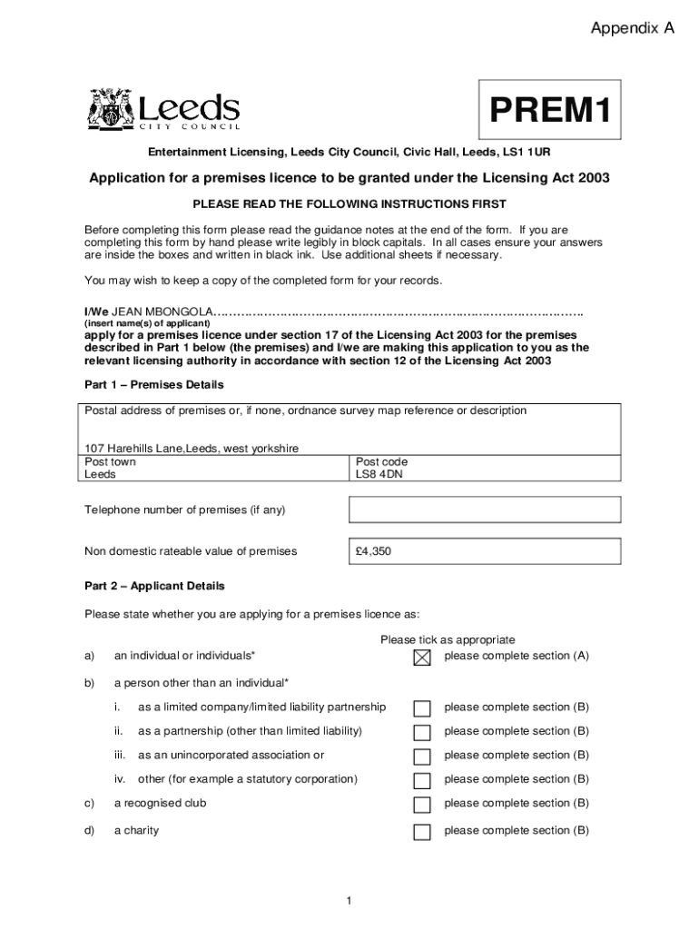 Appendix APREM1 Entertainment Licensing, Leeds City Council, Civic Hall, Leeds, LS1 1URApplication for a premises licence to be granted under the Licensing Act 2003 PLEASE READ THE FOLLOWING INSTRUCTIONS